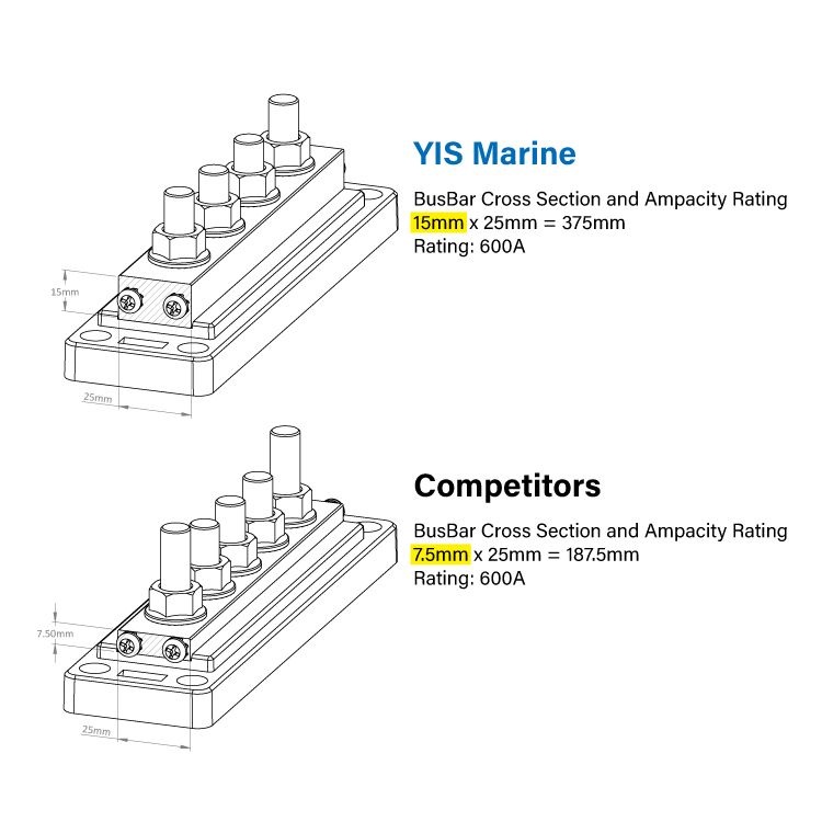 Like electrical cables, the higher temperature the insultation next to the conductors can endure, the larger current the cable or busbar is allowed to carry. For example, an 8AWG single conductor cable (cross section area around 8.4 mm²) is rated 65A with insulation rated at 75°C. However, a cable with same 8 AWG (8.4 mm²) conductor would be rated 80A if its insulation is rated at 105°C. In YIS Marine we use mostly Glass Fiber reinforced Nylon 66 (PA66+GF), which has more than 200°C deformation temperature, as bus bar insulation base and this would ensure busbars of the same conductor size have best current rating in the market.